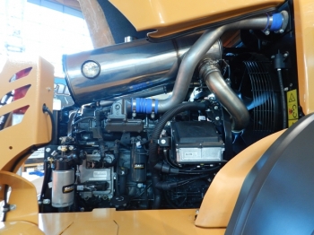 Il motore, 194hp, 6 cilindri e 6,7 litri di cilindrata, è emissionato Tier 4i tramite SCR (riduzione catalitica selettiva), tecnologia che elimina la necessità di filtro antiparticolato. La trasmissione PROSHIFT a 5 velocità con convertitore di coppia bloccabile (lock-up) riduce i giri del motore diminuendo i consumi, e il modulo di raffreddamento “Cooling Cube” heavy-duty è espressamente pensato per applicazioni particolarmente gravose e turni di lavoro a ciclo continuo.