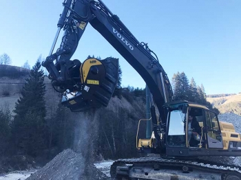 Una difficoltà in più in questo quadro ce l’hanno le imprese che lavorano alla costruzione e manutenzione delle piste da sci e delle relative opere infrastrutturali di corredo; qui la logistica è davvero estrema, le finestre temporali per lavorare molto brevi e, quindi, lo spazio per errori è davvero poco. Proprio per questo fioriscono nei parchi macchine gli impieghi innovativi di attrezzature utilizzate per portare a termine lavori molto difficili da fare con metodi tradizionali. Esempio perfetto di questa “creatività montanara”, la benna frantoio appena consegnata da MB Crusher a un’azienda dell’Alta Badia, specializzata nella costruzione e manutenzione degli impianti da sci, ma con tanta esperienza anche nel segmento del movimento terra.