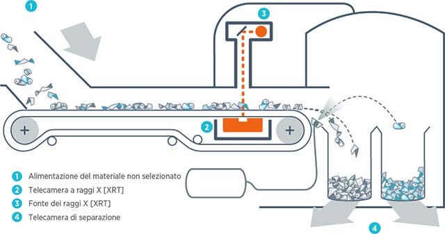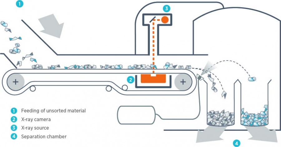 X-TRACT utilizza la tecnologia di trasmissione a raggi X (XRT) per selezionare i materiali in base alle differenze di densità. La radiazione a banda larga penetra nel materiale per fornire informazioni sull'assorbimento spettrale che viene poi misurato con una telecamera a raggi X altamente sensibile per identificare la densità atomica del materiale, indipendentemente dal suo spessore.