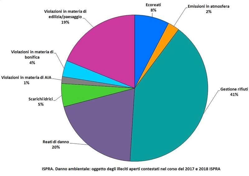 La maggior parte delle istruttorie per danno ambientale è oggi associata a illeciti compiuti nella gestione dei rifiuti (41%), violazioni in materia di edilizia e paesaggio (19%) e scarichi fuori norma (5%). Un 8% è legato ai cosiddetti ‘ecoreati’ individuati della recente legge n. 68/2015 (disastro ambientale, inquinamento, omessa bonifica), nonché a illeciti relativi alle emissioni in atmosfera, in materia di bonifiche o di AIA (Autorizzazione Integrata Ambientale).
