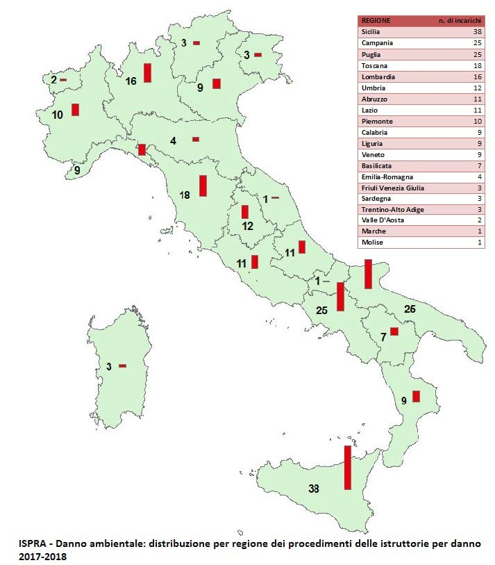 Tra 2017 e 2018 Ispra e le Agenzie ambientali hanno seguito, per conto del Ministero dell’ambiente, le istruttorie di 217 casi di danno ambientale distribuiti su tutto il territorio nazionale.