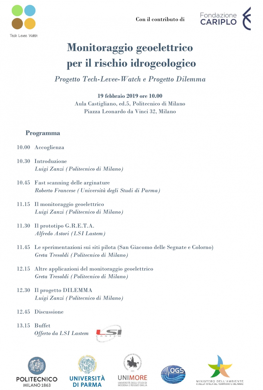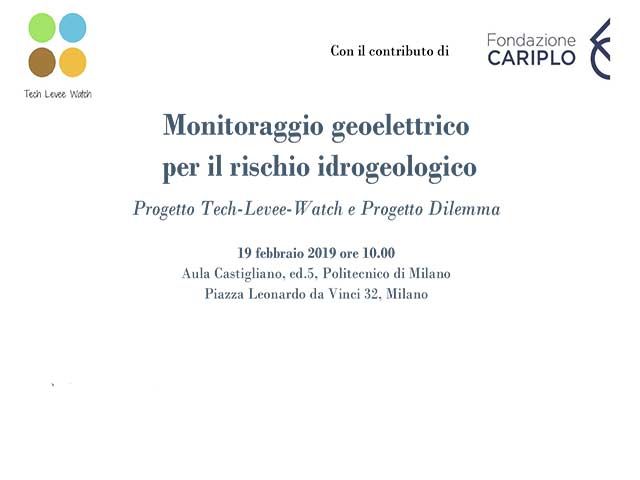 Martedì 19 febbraio 2019 presso il Politecnico di Milano, Piazza Leonardo da Vinci 32, Aula Castigliano ed.5, ore 10.00, si terrà il convegno dal titolo Monitoraggio geoelettrico per il rischio idrogeologico: Progetto Tech-Levee-Watch e Progetto Dilemma.