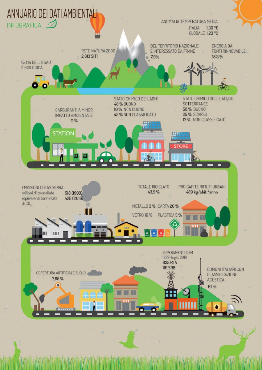 Una banca dati con 306 indicatori, tra cui 9 new entries, per un totale di 150.000 dati, organizzati in 460 tabelle e 635 grafici. Biodiversità, Clima, Inquinamento atmosferico, Qualità delle acque interne, Mare e ambiente costiero, Suolo, Rifiuti, Agenti fisici sono solo alcuni dei temi trattati nell’edizione 2018 dell’Annuario dei dati ambientali ISPRA, la pubblicazione scientifica di dati statistici e informazioni sull’ambiente realizzata dall’Istituto in stretta collaborazione con il Sistema Nazionale per la Protezione dell’Ambiente (SNPA)