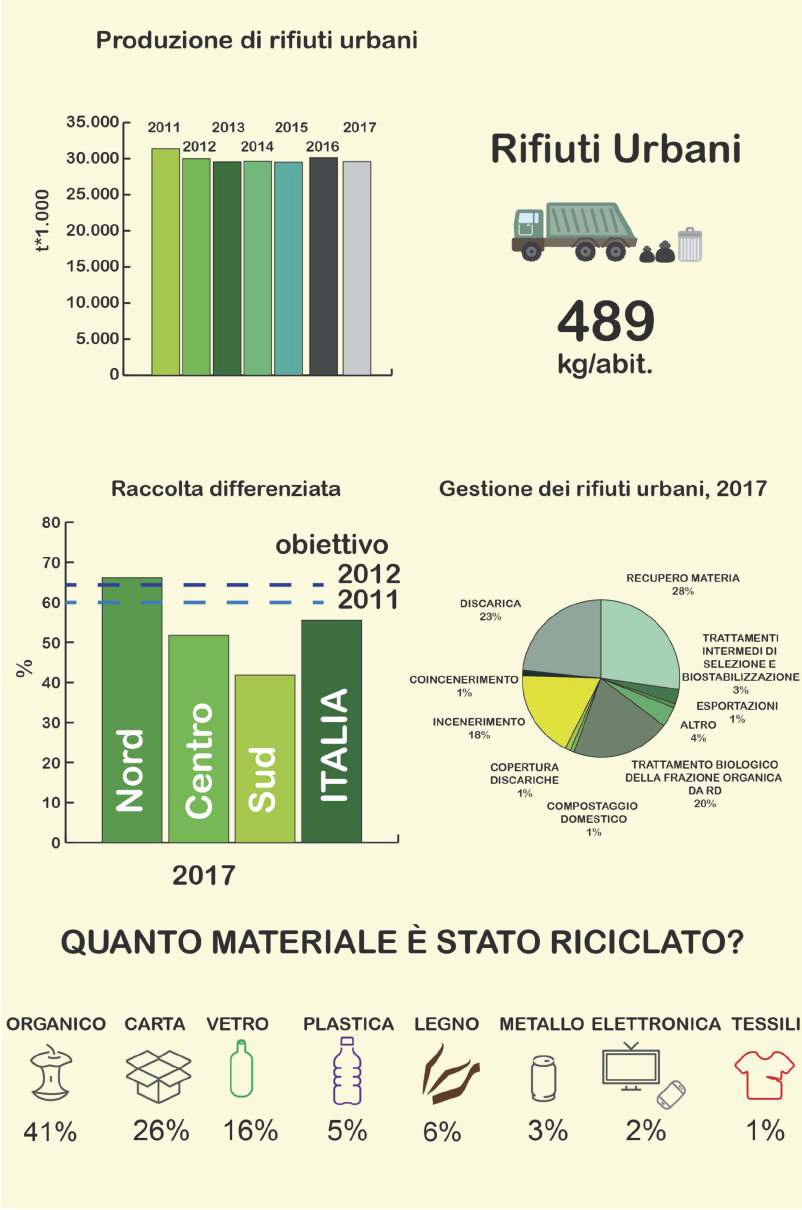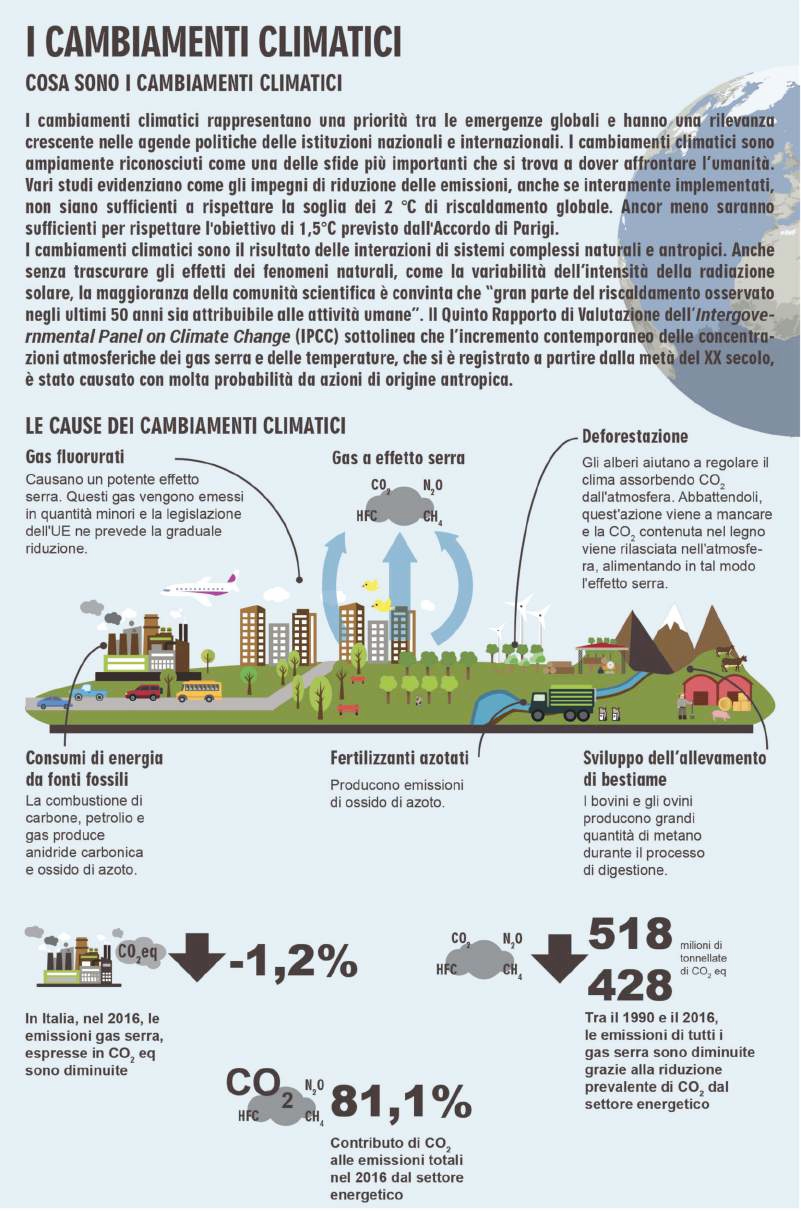 La caratteristica più rilevante del clima in Italia nel 2017 è stata la siccità. Con una precipitazione cumulata media al di sotto della norma del 22% circa, il 2017 si colloca al 2° posto, appena dopo il 2001, tra gli anni più “secchi” dell’intera serie dal 1961. E’ stata di +1,30 °C l’anomalia della temperatura media in Italia, superiore a quella globale sulla terra ferma (+1,20 °C). Le emissioni totali di gas serra dal 1990 al 2016 sono diminuite del 17,5%. Il valore limite giornaliero (50 μg/m3 da non superare più di 35 volte per anno civile), di PM10 nel 2017 non è stato rispettato nel 31% delle stazioni. Complessivamente, però, dal 1990 al 2016 le emissioni nazionali di particolato atmosferico PM10 sono in diminuzione del -33,7% e le emissioni complessive di ossidi di zolfo, ossidi di azoto e ammoniaca sono in calo del -66,8%.