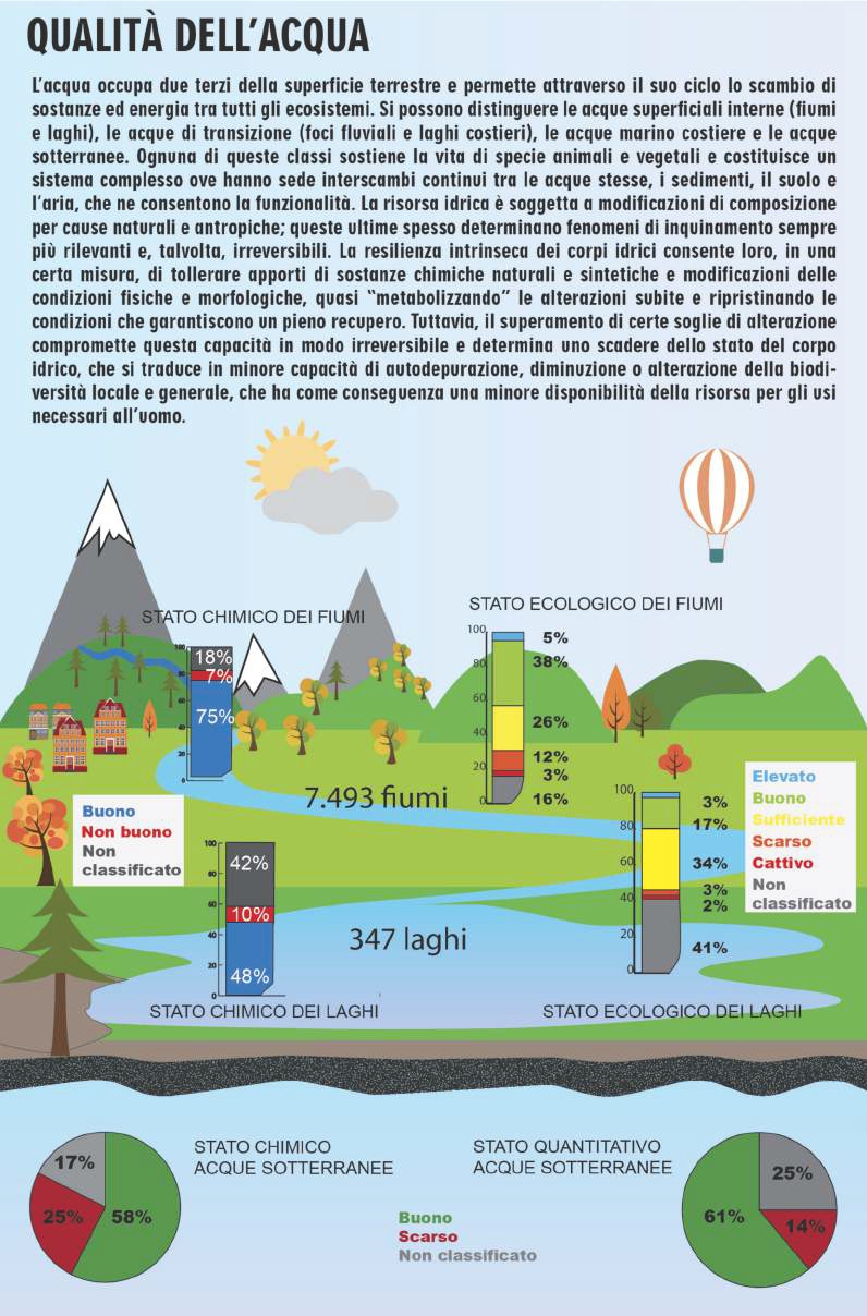 Su 7.493 fiumi, il 43% raggiunge l'obiettivo di qualità per lo stato ecologico e il 75% quello di qualità per lo stato chimico. Su 347 laghi, il 20% raggiunge l'obiettivo di qualità per lo stato ecologico e il 48% quello di qualità per lo stato chimico. Fiumi: buono ed elevato lo stato ecologico per la Provincia di Bolzano (94%), Valle d'Aosta (88%), Provincia di Trento (86%) e Liguria (75%); uno stato chimico buono superiore al 90% per i fiumi in Molise, Piemonte, Valle d'Aosta, Liguria, Emilia-Romagna, Umbria, Marche, Lazio, Abruzzo e le province autonome di Trento e Bolzano. Laghi: obiettivo di qualità ecologica buono in Valle d'Aosta (100%), Provincia di Bolzano (89%), Emilia-Romagna (60%) e stato chimico buono per il 100% dei corpi idrici lacustri in Valle d'Aosta, Liguria, Emilia-Romagna, Abruzzo, Molise e nella Provincia di Bolzano.