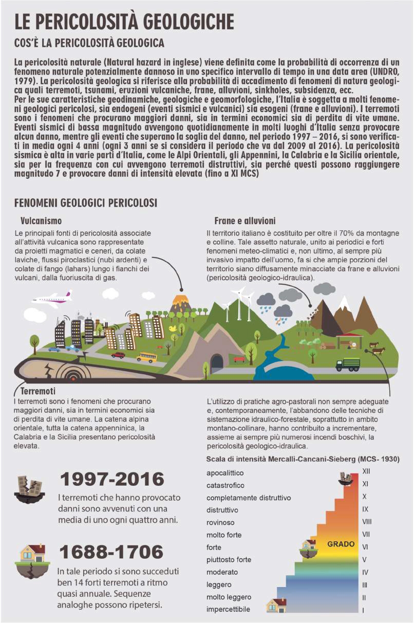 I principali eventi di frana nel 2017 sono stati 172 e hanno causato complessivamente 5 vittime, 31 feriti e danni prevalentemente alla rete stradale, eventi distribuiti in particolare nelle regioni Abruzzo, Campania, Sicilia, Trentino-Alto Adige, Lombardia e Marche. Diverse sono state le frane che si sono attivate/riattivate in Abruzzo, sia a causa dello scioglimento della neve caduta nell’eccezionale nevicata del 18 gennaio del 2017, sia delle intense precipitazioni. In Italia, oltre 6 milioni di abitanti sono residenti in aree a pericolosità idraulica media (tempo di ritorno tra 100 e 200 anni), mentre la popolazione a rischio frane, se si considerano le 2 classi a maggiore pericolosità (elevata e molto elevata), è pari a oltre 1,2 milioni di abitanti.