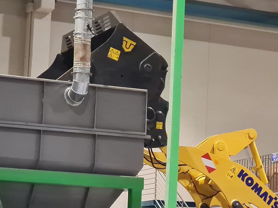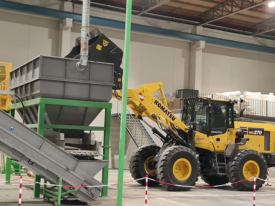 L’impianto è un gioiello di tecnologia ed è dotato di innovativi macchinari come la pala gommata Komatsu WA270 dotata di benna ad alto ribaltamento Trevi Benne, il vaglio flip flow di Binder+Co e la selezionatrice Steinert KSS.