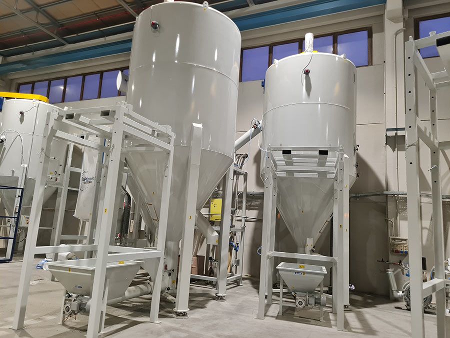 Le materie plastiche sono poi macinate a dimensione di 1/1.5 cm per renderle omogenee e più facilmente separabili nelle fasi successive.