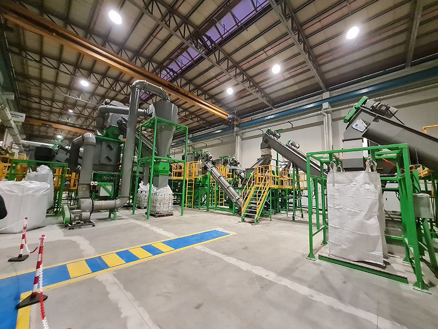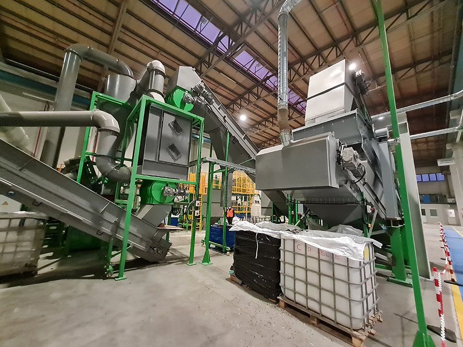 Linea WET: per ottenere una elevata qualità della plastica riciclata, la pulizia del materiale in ingresso è fondamentale: come prima cosa si separano eventuali materiali estranei come ferro, polveri, attraverso vagli, magneti e sistemi aeraulici. Dopo questa fase di separazione, le plastiche sono sottoposte a flottazione: nelle prime 2 vasche si rimuovono prima i metalli e poi le plastiche “caricate”, ovvero potenzialmente contenenti i ritardanti di fiamma bromurati, come previsto dal d.Lgs. 49/2014. Proseguendo con le fasi di pulizia, mediante sensori ottici vengono rimossi frammenti di legno.