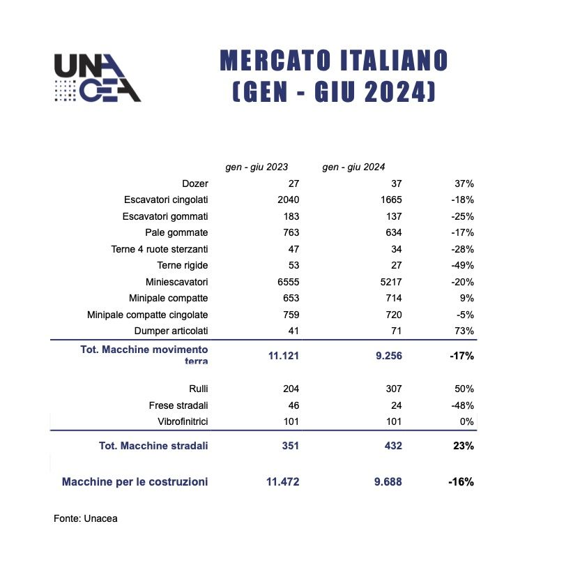Nei primi sei mesi del 2024 sono state immesse sul mercato italiano 9.688 macchine per costruzioni, con una diminuzione del 16% rispetto a quanto rilevato nel primo semestre del 2023. Più in dettaglio, sono state 9.256 le macchine movimento terra vendute (-17%) e 432 le macchine stradali (+23%). I dati sono stati elaborati da Unacea sulla base dei risultati di vendita dei produttori e degli importatori di macchine movimento terra e per i lavori stradali.