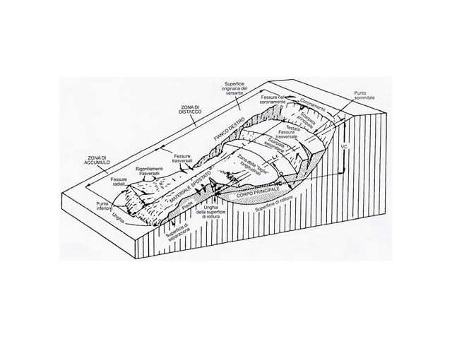 L’area in cui avviene il distacco si chiama corona, la parte centrale, dove avviene lo spostamento del materiale, corpo di frana, mentre la parte di accumulo finale unghia. Molto spesso a causa della superficie irregolare e al difficoltoso deflusso dell’acqua si possono formare nei dossi e nelle conche dei laghetti di frana.