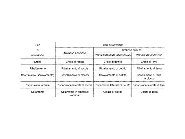 Il tipo di classificazione di frana più utilizzato è quello di Cruden e Varnes che mette in relazione il tipo di movimento con il materiale coinvolto.