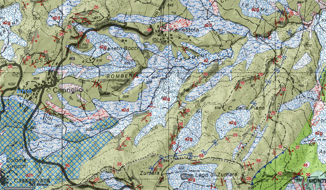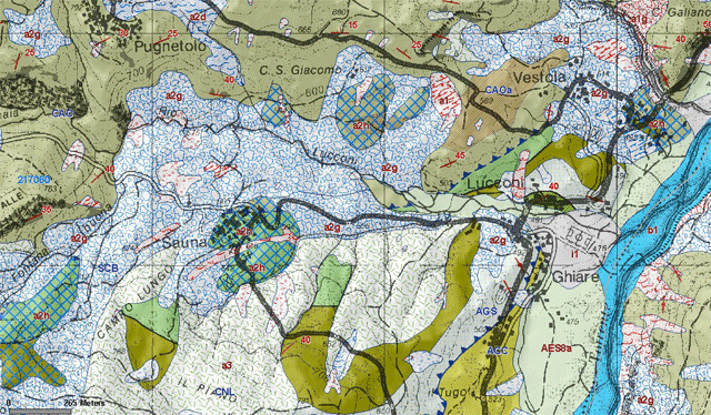 La litologia prevalente è quella appartenente al flysch di Monte Caio e si può notare in figura 5 che la zona intorno all’abitato di Sauna ha delle caratteristiche di frana quiescente (per quiescente si intende una frana che dopo un tot di tempo si riattiva).